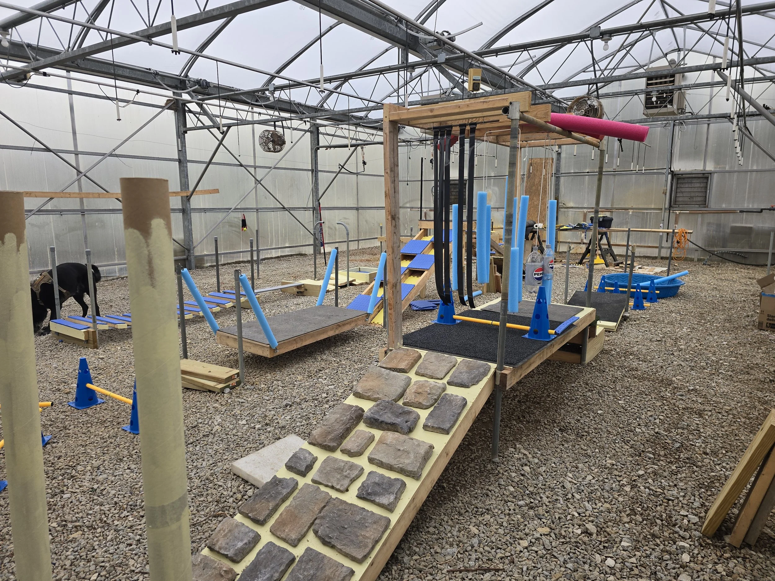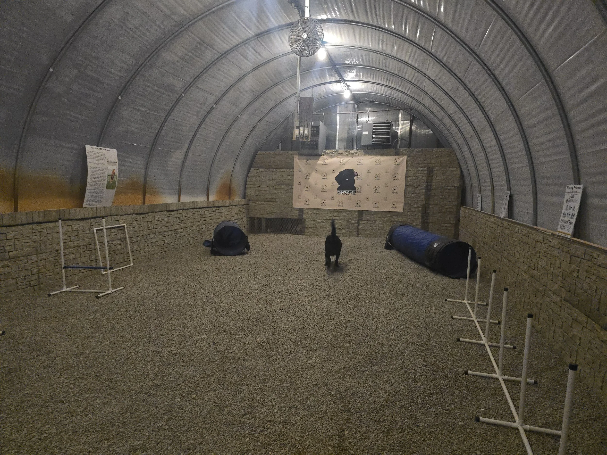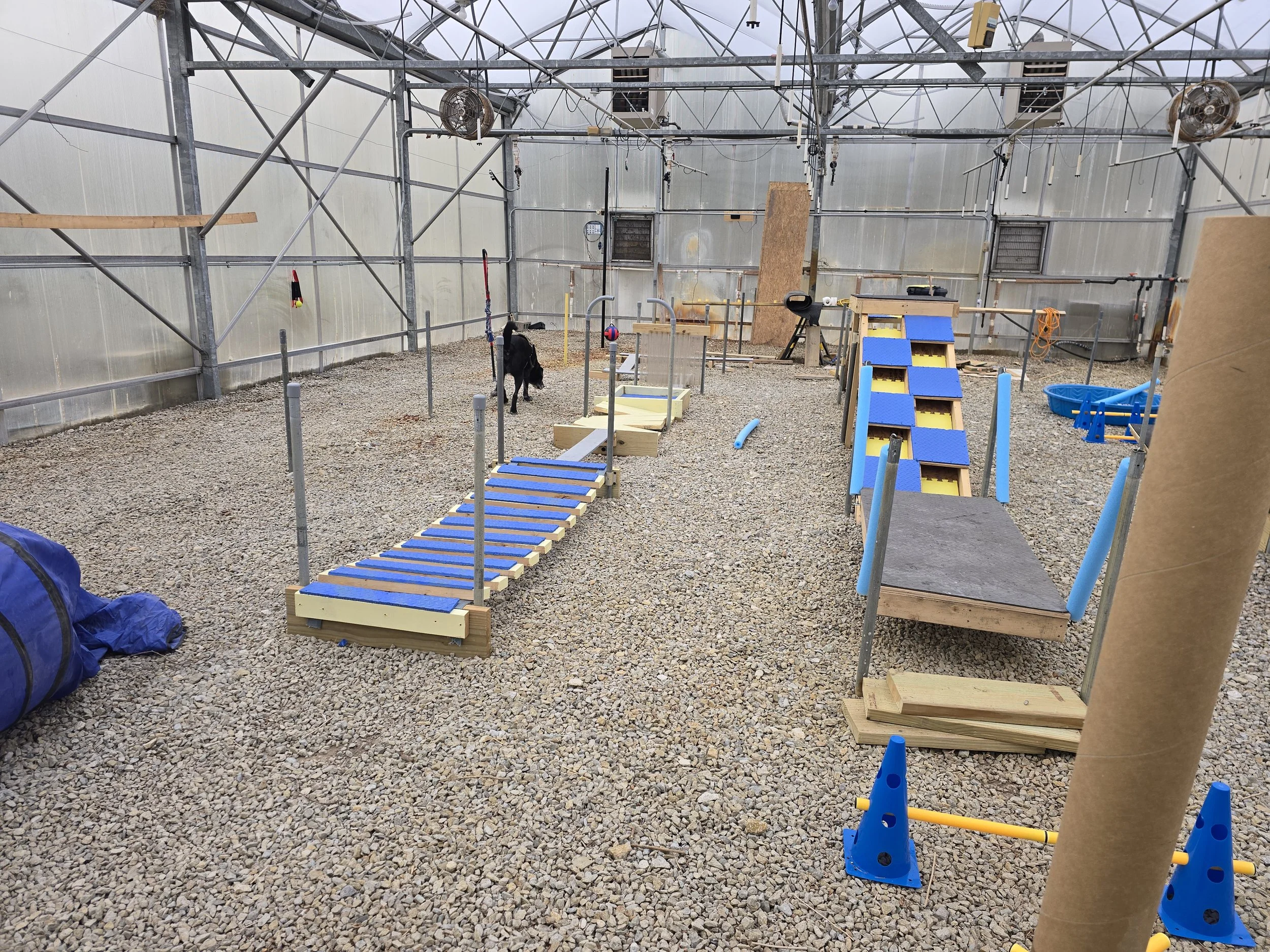 Our first INDOOR area. About 1000 sq ft greenhouse with lights and heat. Excellent space to burn off some zoomies and practice some training. When the sun is out it can be a bit warm at high noon - but if its cloudy we can turn on the heat and keep it comfortable for your pup.